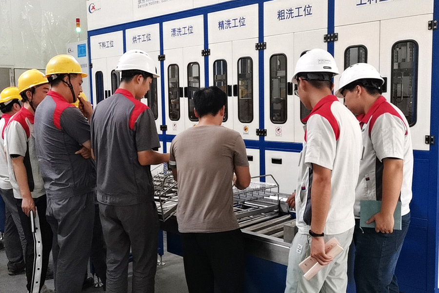 導讀:該設備有自動上下料及轉角系統、超聲波清洗系統,自動拋動、自動溢流和油污分離裝置,噴淋系統、自動高壓切水系統、自動烘干系統。機械手自動輸送系統采用高精度直線導軌配合高精度位置檢測傳感器